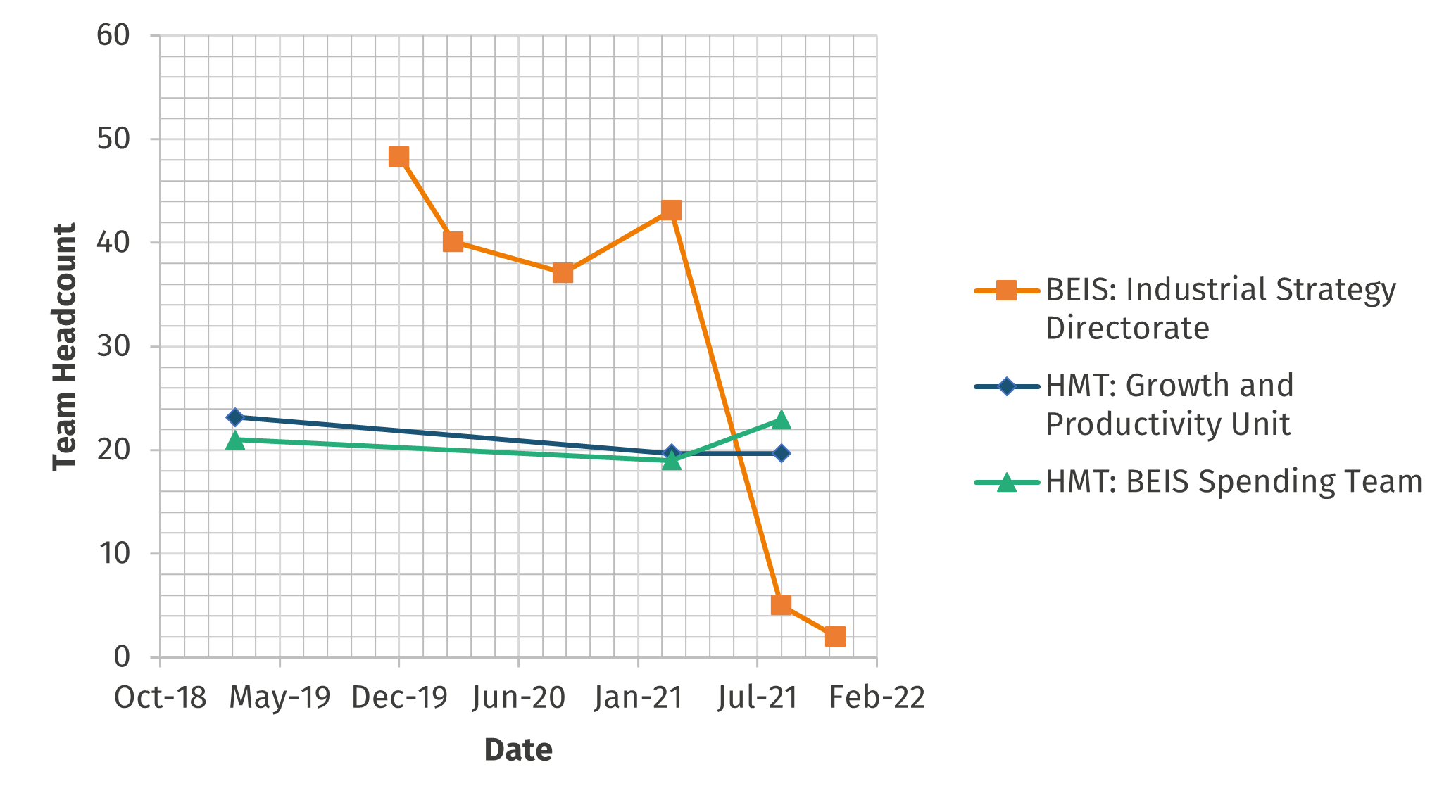 When BEIS lost the Industrial Strategy brief it disbanded its Industrial Strategy directorate who worked to the Director General for Industrial Strategy, Science and Innovation. From its peak in March 2021 with a headcount of 43 (full-time equivalent), the team had shrunk to just five by September 2021 and two by the end of the year. Worryingly, upon taking on the brief, the Treasury team responsible has remained at the exact same headcount over the same March to September period.