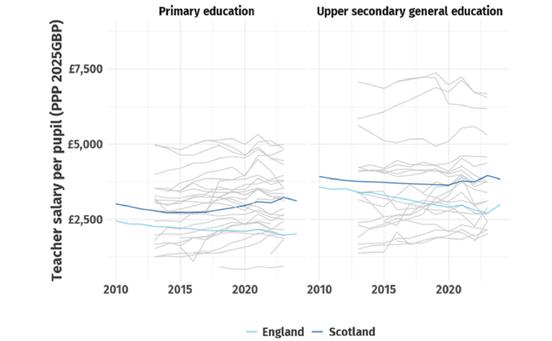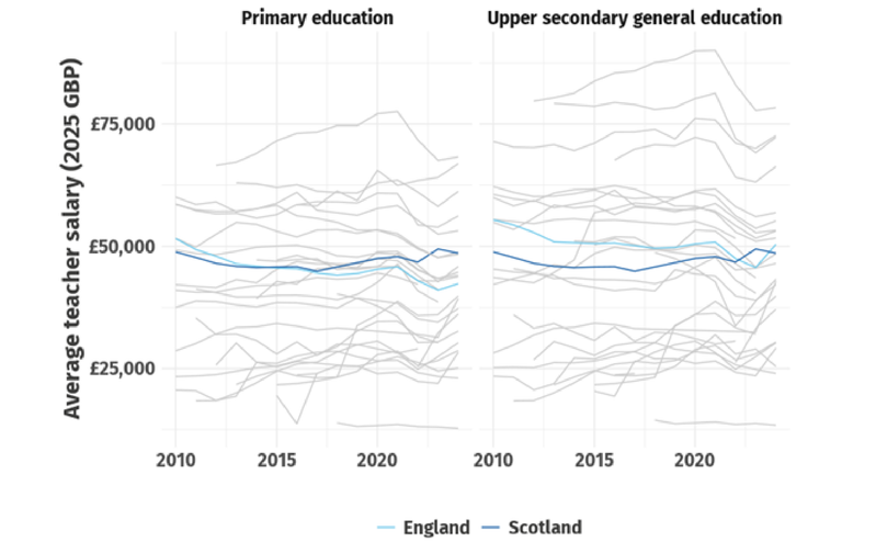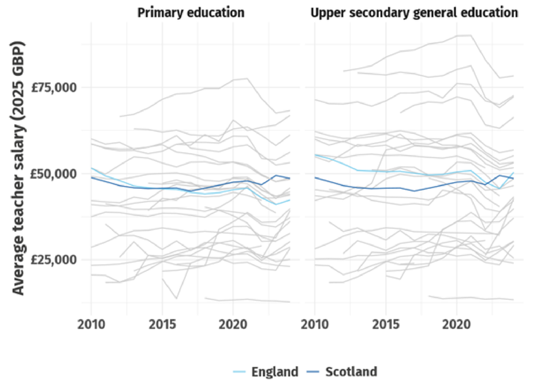 Average pay in Scotland has increased relative to England, and while this has led to a gap opening up among primary school teachers, it has led to convergence at secondary level. But in an international context, what is striking is the similarity between pay in Scotland and England.