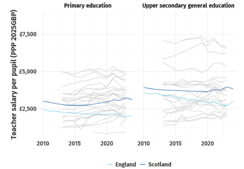 Figure 2. Teacher pay per pupil in Scotland has broadly tracked international trends