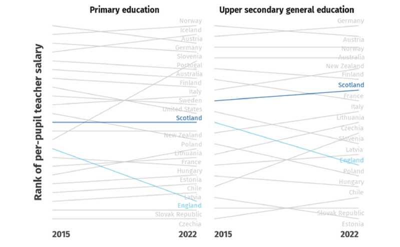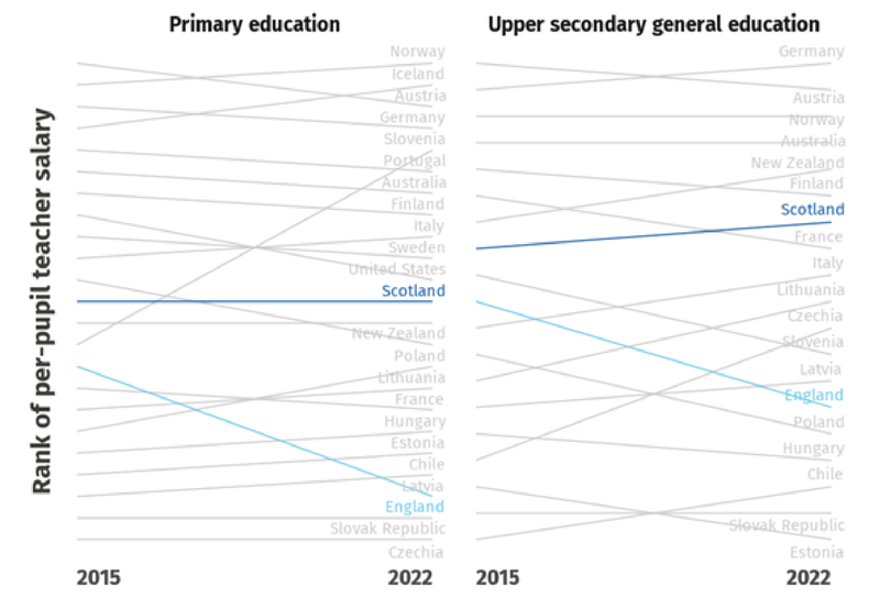 Figure 3: The position of Scotland’s teachers in international ranking of pay per pupil has held steady, while England’s teachers have fallen back