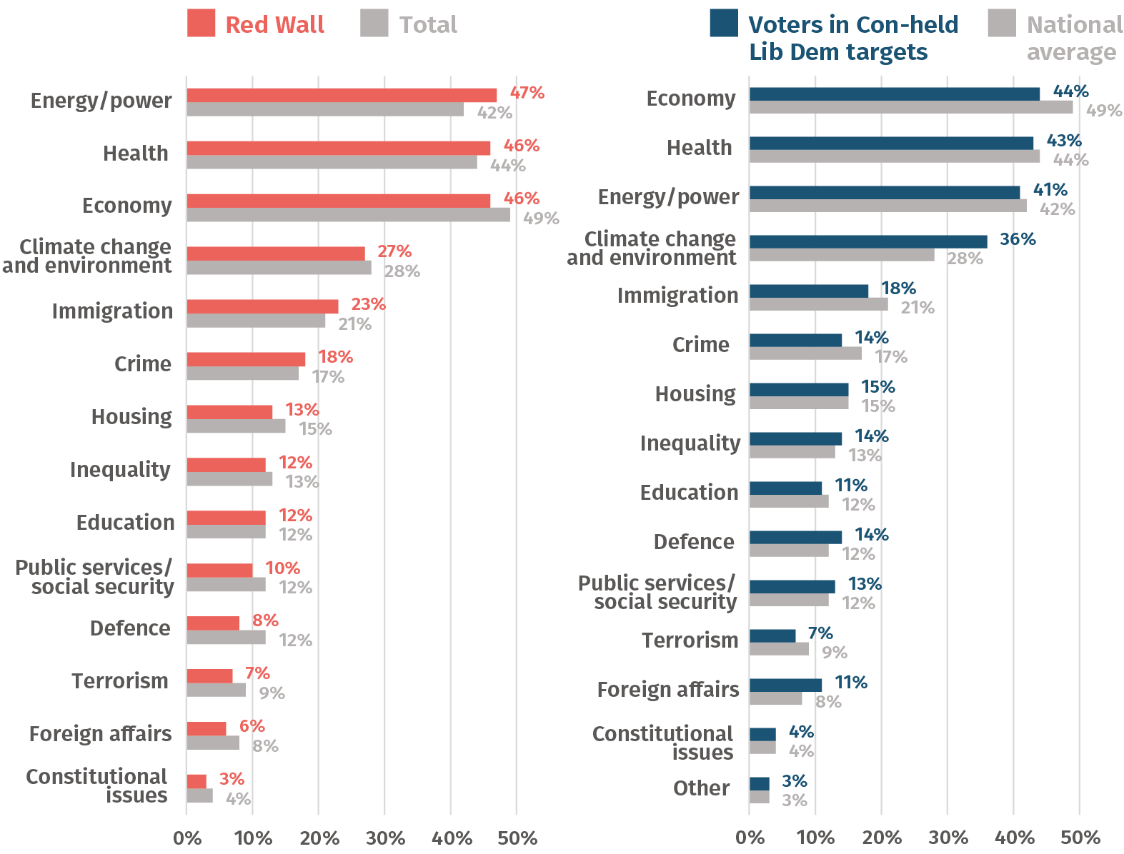 Top 3 issues facing the country for ‘red wall’ voters (left) and for voters in Conservative-held Liberal Democrat target seats (right)