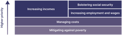 In our view, bolstering social security should come top of the priority list, followed by increasing employment and wages. Next should come managing costs with mitigating the effects of poverty after that.