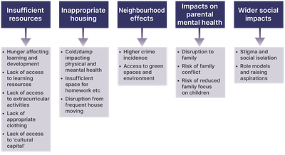 - Insufficient parental resources, leading for example to hunger and children missing out on experiences affordable to their higher income peers, such as school trips.