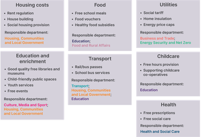 There are a number of costs associated with running a household and raising children which could be reduced or eliminated for low-income households. We map these out below against likely responsible government departments, again to be illustrative of the wide scope rather than being exhaustive.