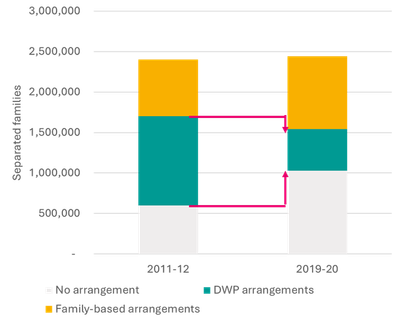 As Figure 1 shows, more than one million separated families went without a maintenance arrangement as of 2020, compared with around 600,000 in 2012 before the reforms took hold. Not only has the attempt to squeeze families out of DWP arrangements (shown in green) clearly worked, but this squeeze has also resulted in far more families ending up with no arrangement (grey) than with family-based arrangements (yellow) as the reforms intended.