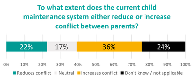 Looking at our polling, among parents in Scotland with experience of the CMS – 35% rate their experience using the CMS as negative (Figure 2); and 36% believed the current maintenance system increases conflict rather than reduces it (Figure 3). As shown in Figure 3, notably more than say it was a positive experience or reduced conflict.