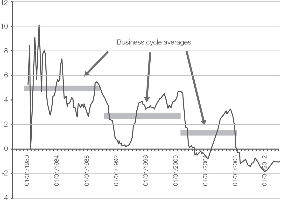 To get an estimate of the real interest rate – of what we think should matter – you need to take an average across whole business cycles, because obviously it fluctuates a lot. There is the Reagan–Bush business cycle, the Bush–Clinton cycle and, again, the Bush cycle. By looking at these three recent business cycles, you see that each successive cycle required lower interest rates than the last in order to get out of the slump. In fact, each successive slump has been harder to get out of. The real interest rate that seems to be necessary on average for our business cycle keeps falling. Even in the 2000–07 cycle it was not easy to escape the slump – even then the Fed was flirting with something like the stagnation that we have had since the 2008 crisis. The amazing thing is that this occurred despite an extraordinary surge of debt. We have not yet reached the end of the current cycle – and it may be a very long way off – but already it looks like the real interest rate will be lower again.