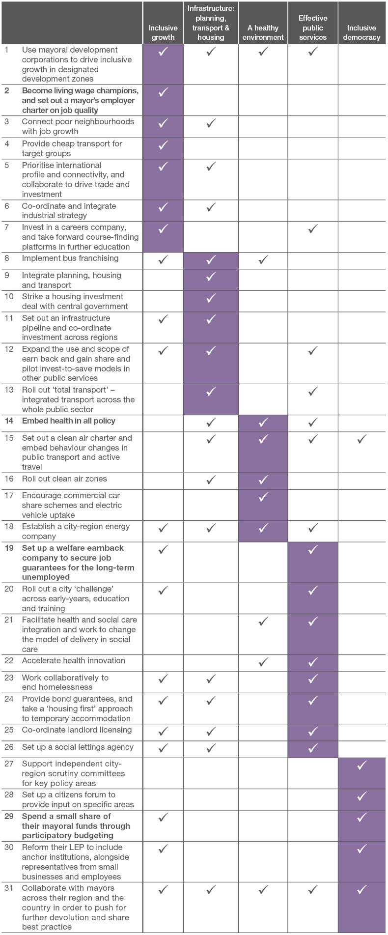 This report proposes 30 policies that mayors can roll out to transform their city regions (see the table below).