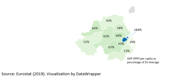 Although Belfast is wealthy by European standards, the remainder of Northern Ireland is much poorer than the European average. 5 of the poorest 10 UK sub-regions are in Northern Ireland and these areas are home to 40 per cent of the Northern Ireland population.