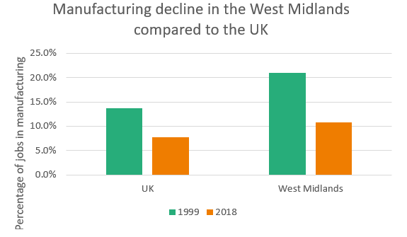 Decline in manufacturing - Manufacturing jobs in the West Midlands have fallen by over 230,000 over the past 20 years, moving from 1 in 5 workers in 1999 to 1 in 10 workers today. This reflects a wider decline in UK manufacturing – but the fall in the West Midlands was particularly large, with 1 in 6 manufacturing job losses in the UK being accounted for in the West Midlands over this period.1
