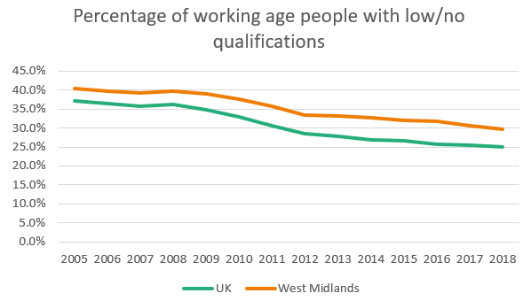 Despite improvements over time, the gap has widened with the rest of the UK. In 2005, working age people in the West Midlands were 9% more likely to have no or low qualifications than working age people across the UK, compared to being 18% more likely in 2018.