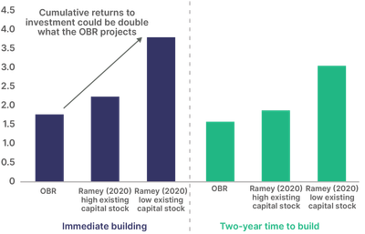 Figure 1: Properly modelling general equilibrium effects mean that returns to investment could be more the double than what the OBR is expecting over a 10-year horizon