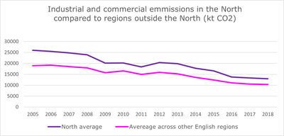 The environmental case for accelerating the decarbonisation of industry is also clear. While the North has reduced its emissions per capita significantly in the past decade, regions like Yorkshire and the Humber still produce significantly more than the average English region. Per capita emissions include emissions produced from both the production of goods and services and their consumption. In the North, industry is a major contributor to the former. As Figure 1 shows, emissions from industry and commercial activity in the North of England remain higher than the average across regions outside the North.
