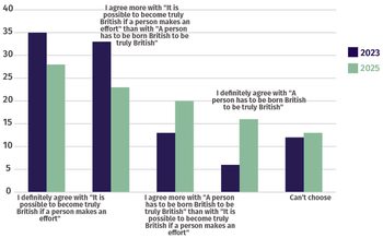 there has been a notable rise over the past two years in the number of people who think being ‘truly British’ is something you are born with rather than something you can become
