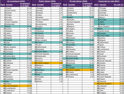 Note: Fewer than 38 countries are shown for private and public sector investment rankings as not all OECD nations have reported their data for the year of 2020, notably South Korea which ranked highly for private sector investment in other years.