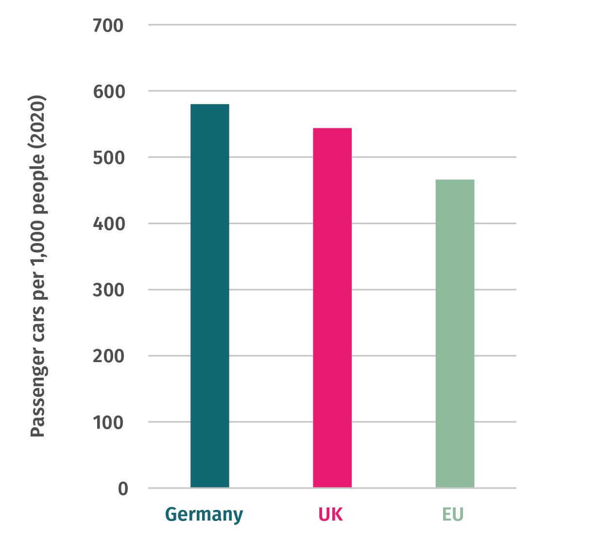 Passenger cars per 1,000 people in Germany, the UK and the EU (2020)