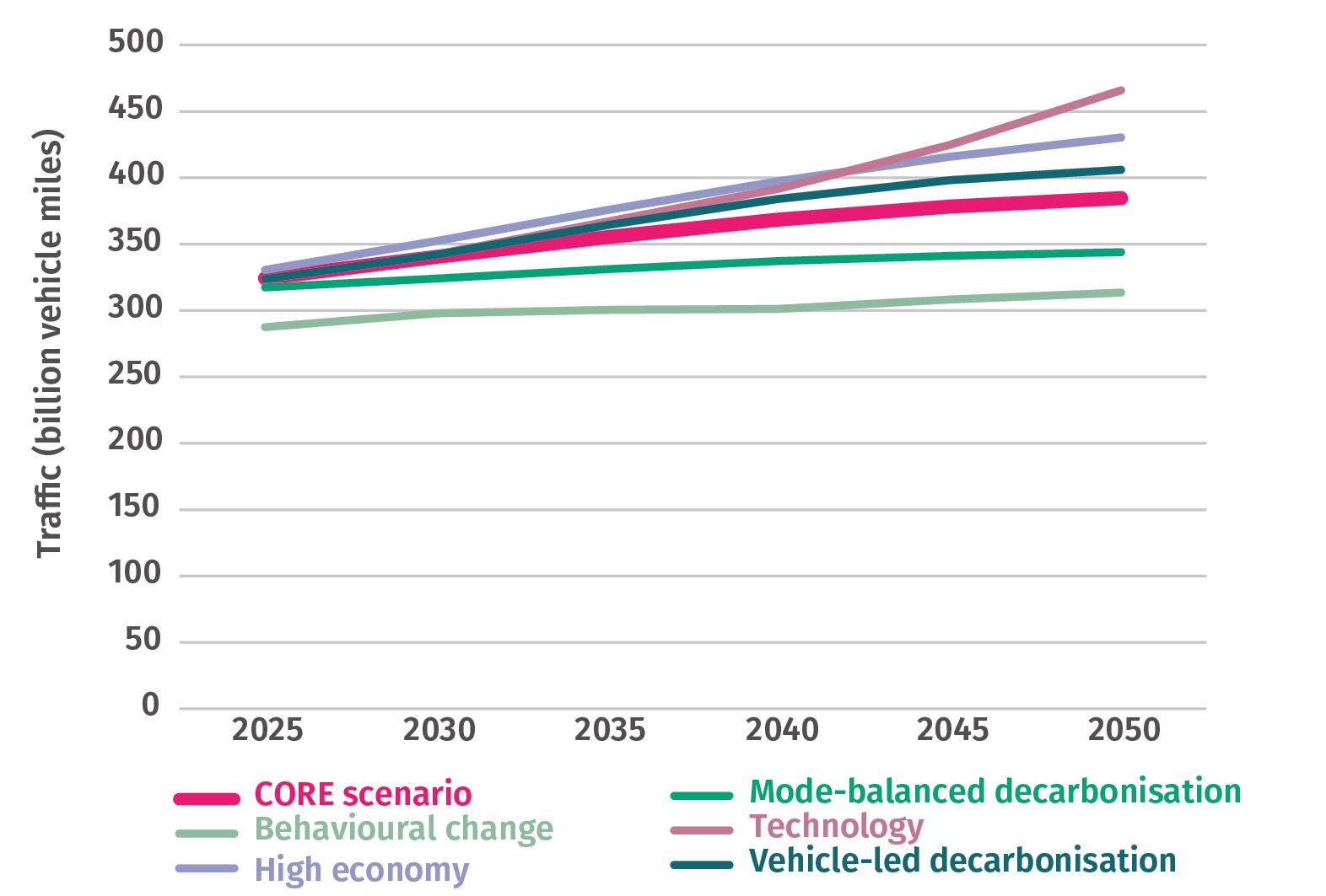 Figure 3: Road traffic in England and Wales is projected to increase in all scenarios