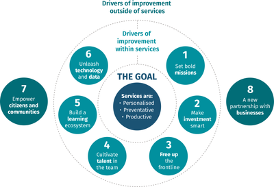 The lessons of these models can be brought together to start to set out a reformed ‘public service reform playbook’ for delivering personal, preventative, and productive public services (see figure 2).