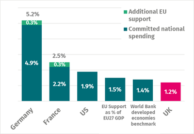Figure 4: The UK now has one of the lowest proportions of spending to address climate change of many comparable global economies