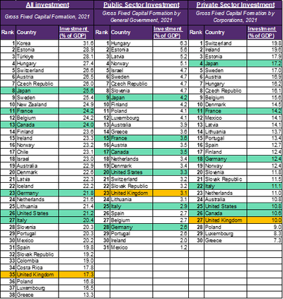 Table – Comparison of levels of investment for OECD countries