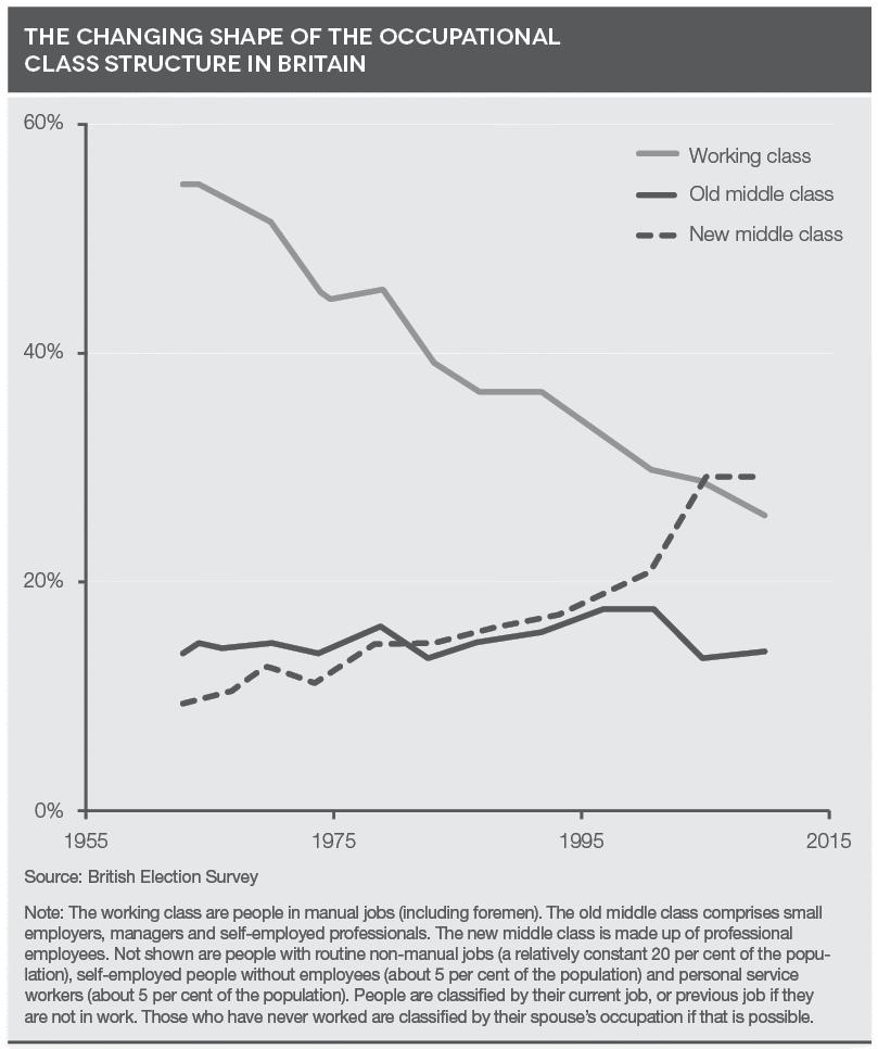 Using data from the British Election Study, figure 1 shows the numbers of people in different occupational social classes over time. It is quite clear that whereas the main point of division in the past was between a large and fairly homogenous working class and a small middle class, now it is between a larger group of heterogeneous middle classes and a smaller working class. There are now more people in the 'new middle class' (essentially professional workers, many in the public sector) than in the working class. The transition from a majority working-class society to a minority working-class society has multiple implications: some psychological, some political.