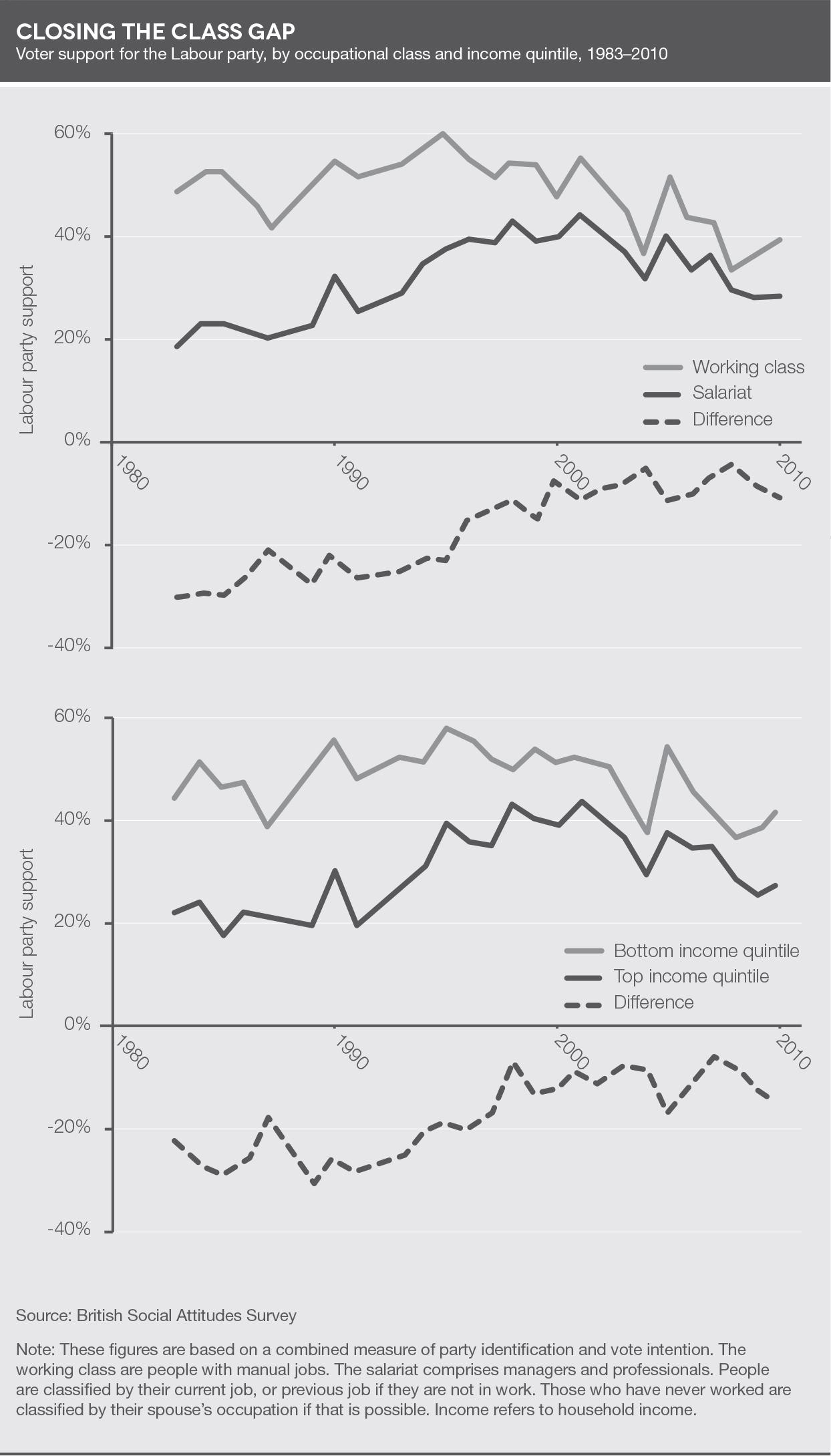 Figure 2, however, shows how support for Labour changed between the early 1980s and the last election in 2010, by class and income. Up to 1992, less than a quarter of professional and managerial workers (the salariat) supported Labour, compared to over 50 per cent of manual workers (the working class). By 1997 this had all changed, and has remained so ever since. Tony Blair famously said he wanted 'to take class out of British politics', and he did. When his government was re-elected in 2001 with another sweeping victory, the gap between the salariat and working class, which was about 30 per cent in 1992, had fallen to less than 10 per cent, a level at which it has essentially remained.