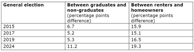 Detailed analysis of voter turnout in the four general elections since 2015 has exposed a significant widening of the turnout gap, particularly between graduates and non-graduates but also between homeowners and renters.