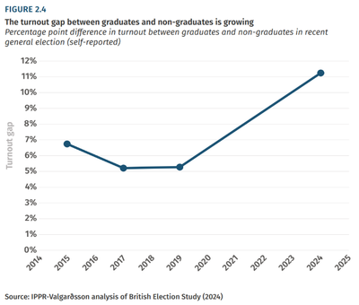 The turnout gap between graduates and non-graduates has more than doubled to 11 percentage points since 2019, a new study by IPPR reveals today.
