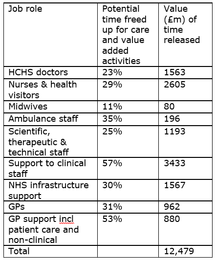 The report identifies communicating medical notes, booking appointments and processing prescriptions among the many activities that should be carried out through digital technology. Researchers have calculated the value of the time that may be released through automation of the current tasks in different roles, freeing up professionals to focus on caring.